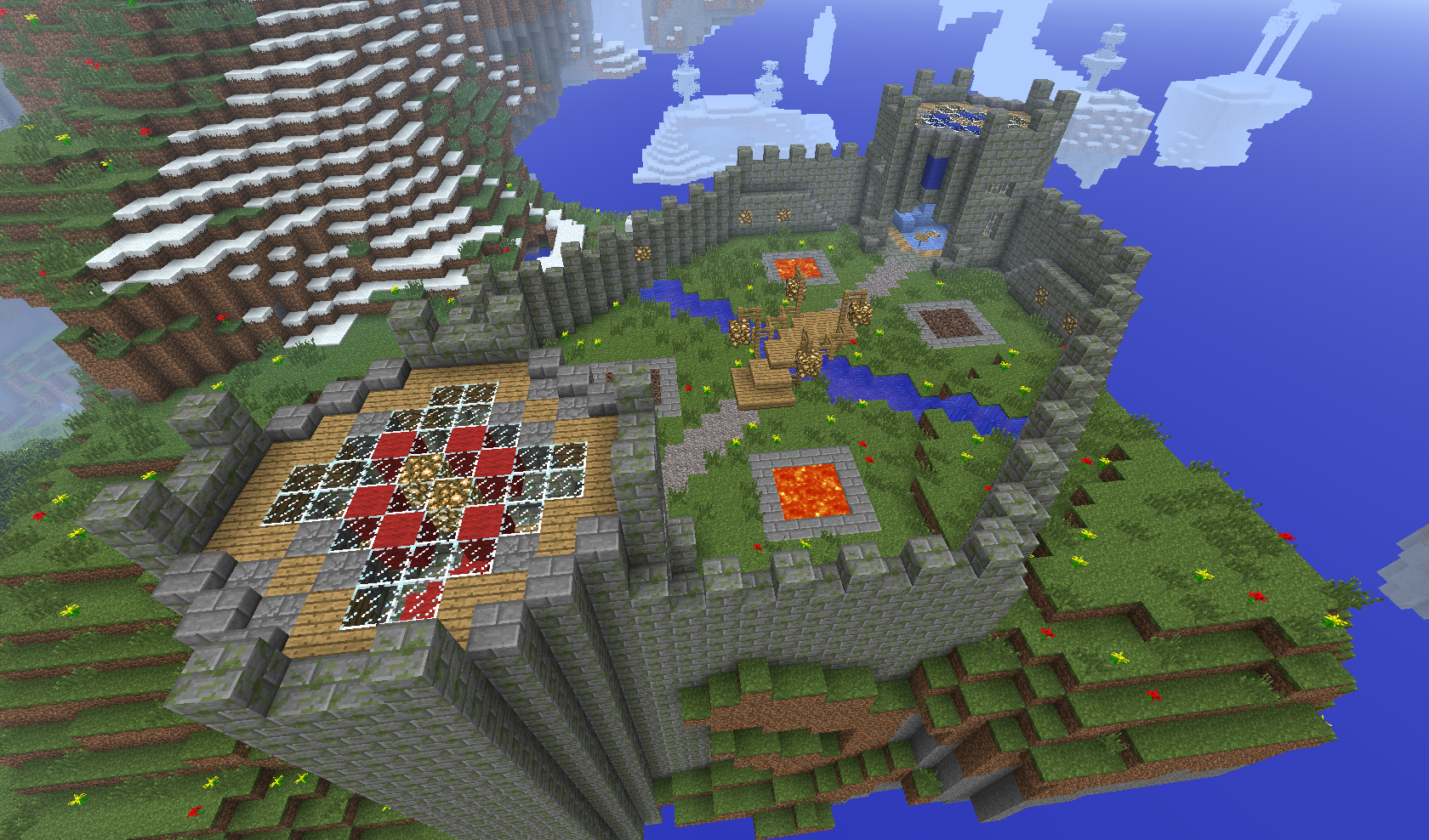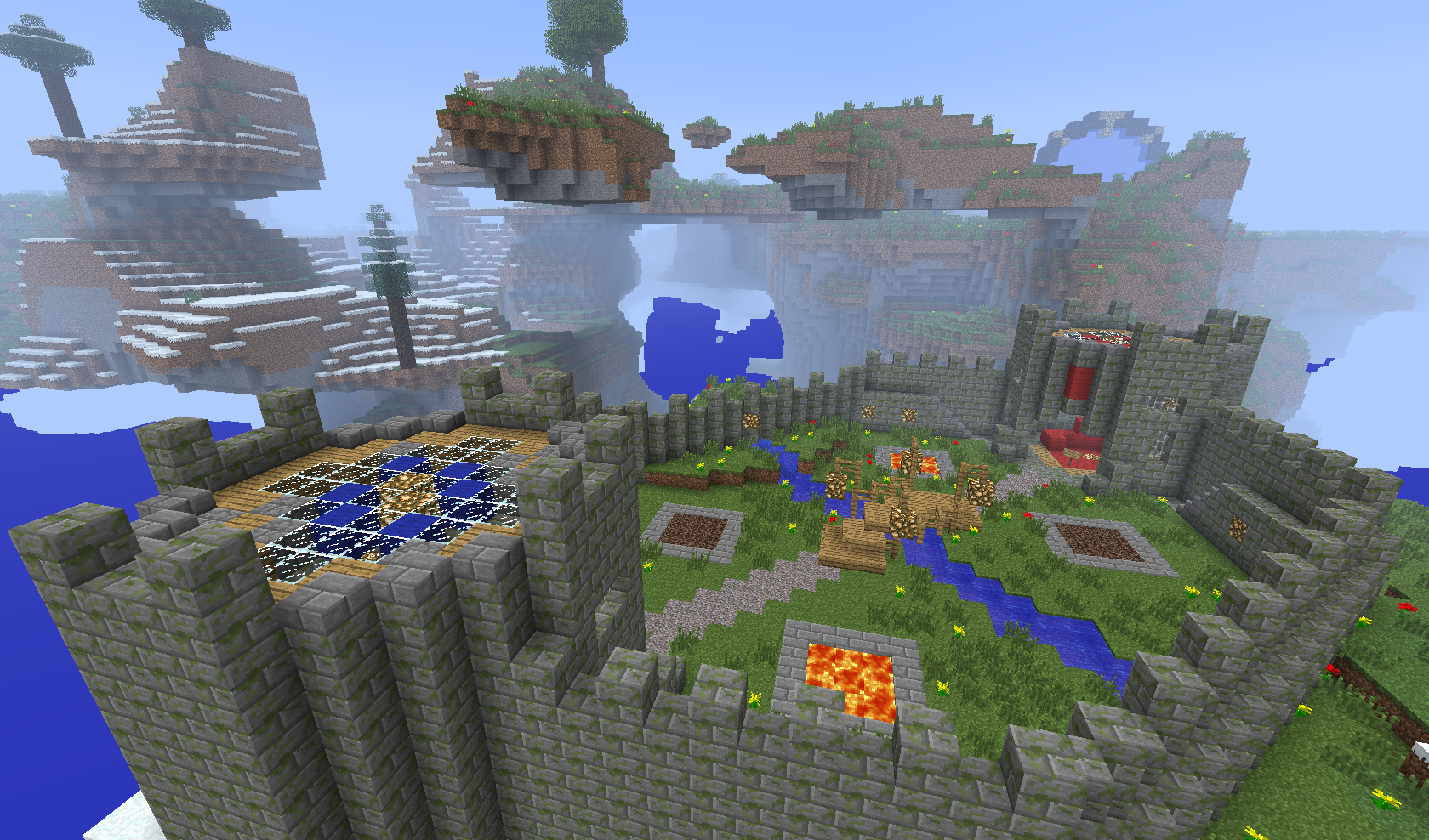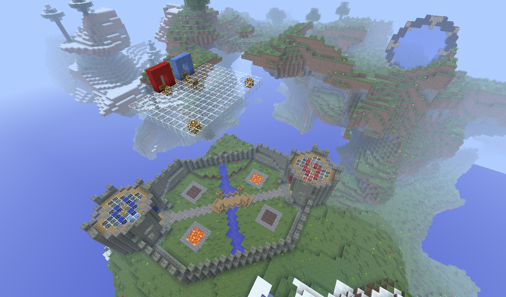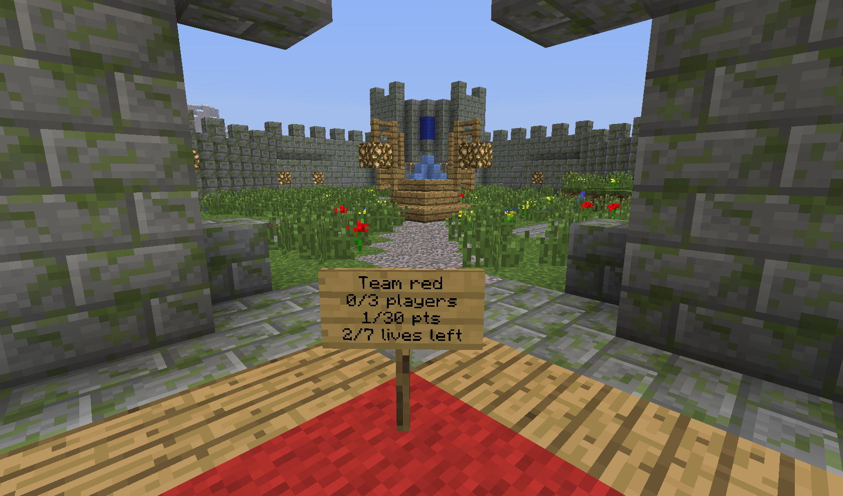 After entering Skylands, just type the command /warzone TinyFortress, which teleports you to the so-called lobby above the battlefield. You split into teams by walking through the gate of the appropriate color. The arena is designed for 3 vs 3 players. For team chat use the command /team [message].